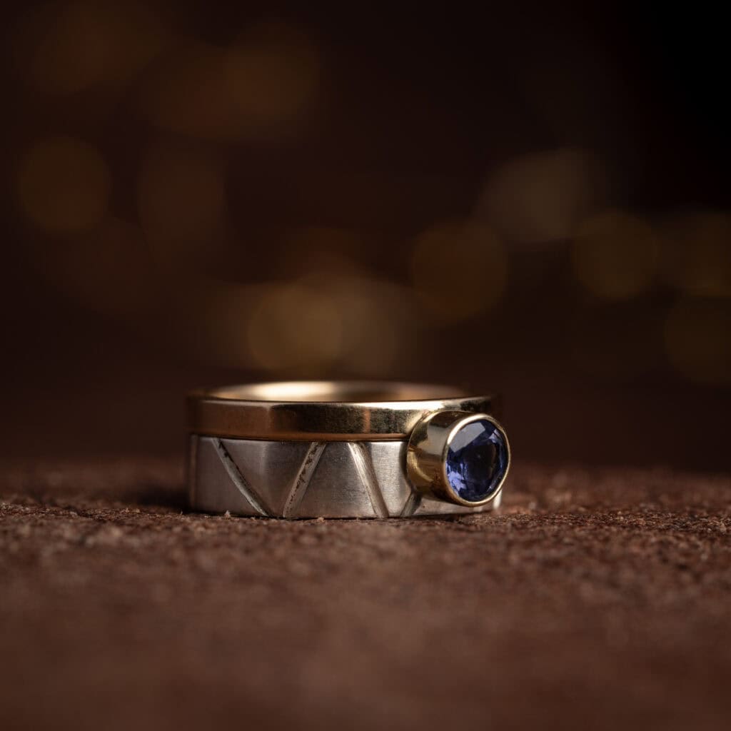 De strakke ring met edelsteen die overhangt is goed te combineren met een bewerkte ring. De onderste ring heb ik “Counting the days” genoemd en de bewerking is met de hand aangebracht. De ring is mat afgewerkt.